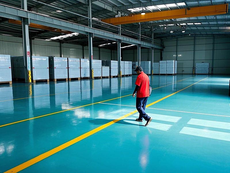 Heavy-duty epoxy and PU flooring designed for factories, warehouses, and production units requiring high load resistance.